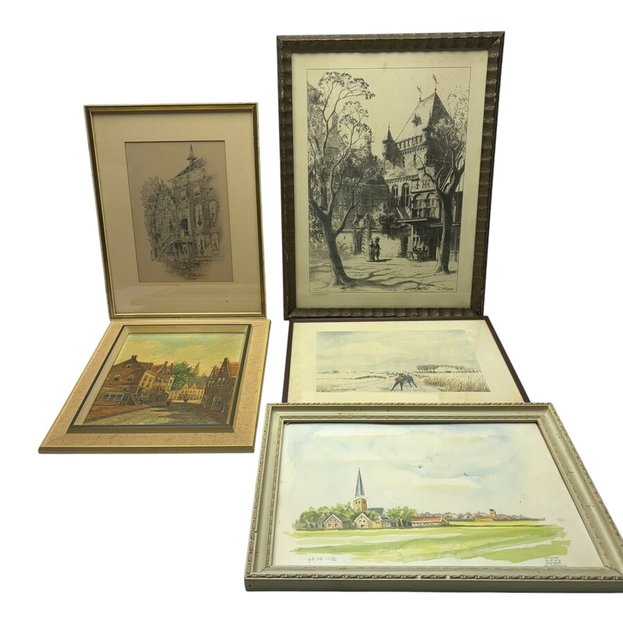 Lot kunstwerken: prentje Elfstedentocht door Bauke Feenstra, prent stadhuis Workum door Cor Reisma, gesigneerd litho kasteel Ids Wiersma, schilderij straatje door J. Rijnders en aquarel Wirdum d...