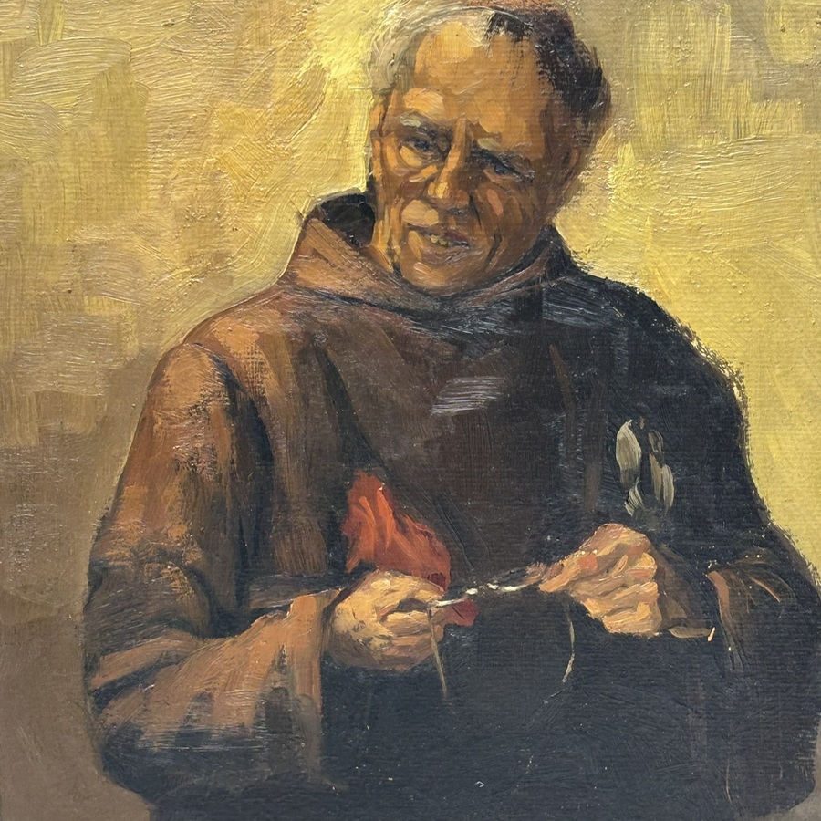 Schilderij, olieverf op schilderskarton. Portret van een pater met bril. Ongesigneerd, Hollandse School 20e eeuw.