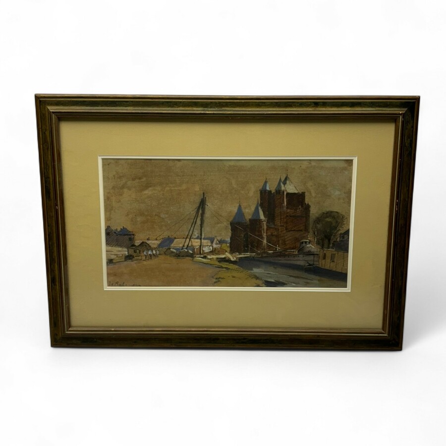 Aquarel op papier, gezicht op de Amsterdamse Poort te Haarlem. Linksonder gesigneerd J.C. Roelandse (Leiden 1888 - Leiderdorp 1978).