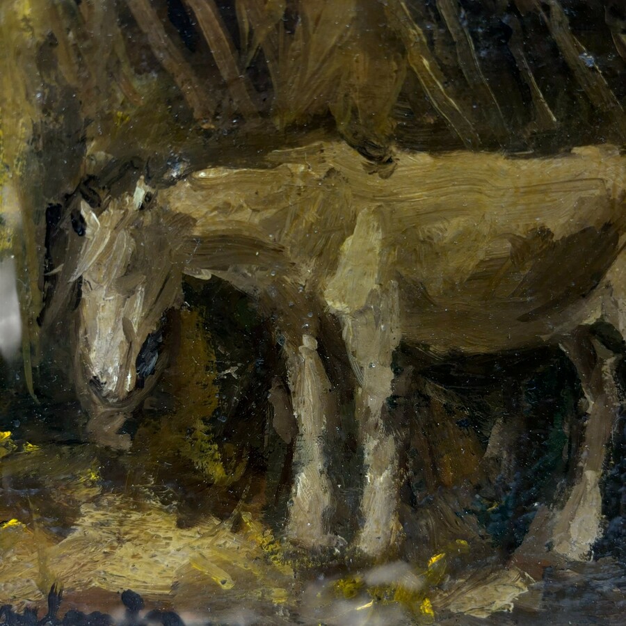 Schilderij, olieverf op doek, gemonteerd op schilderskarton (marouflé). Paard in een donkere stal, linksonder gesigneerd J.C. Roelandse (Leiden 1888 - Leiderdorp 1978).