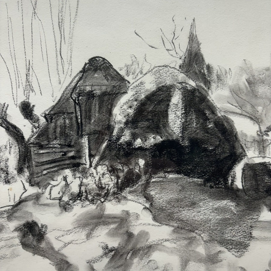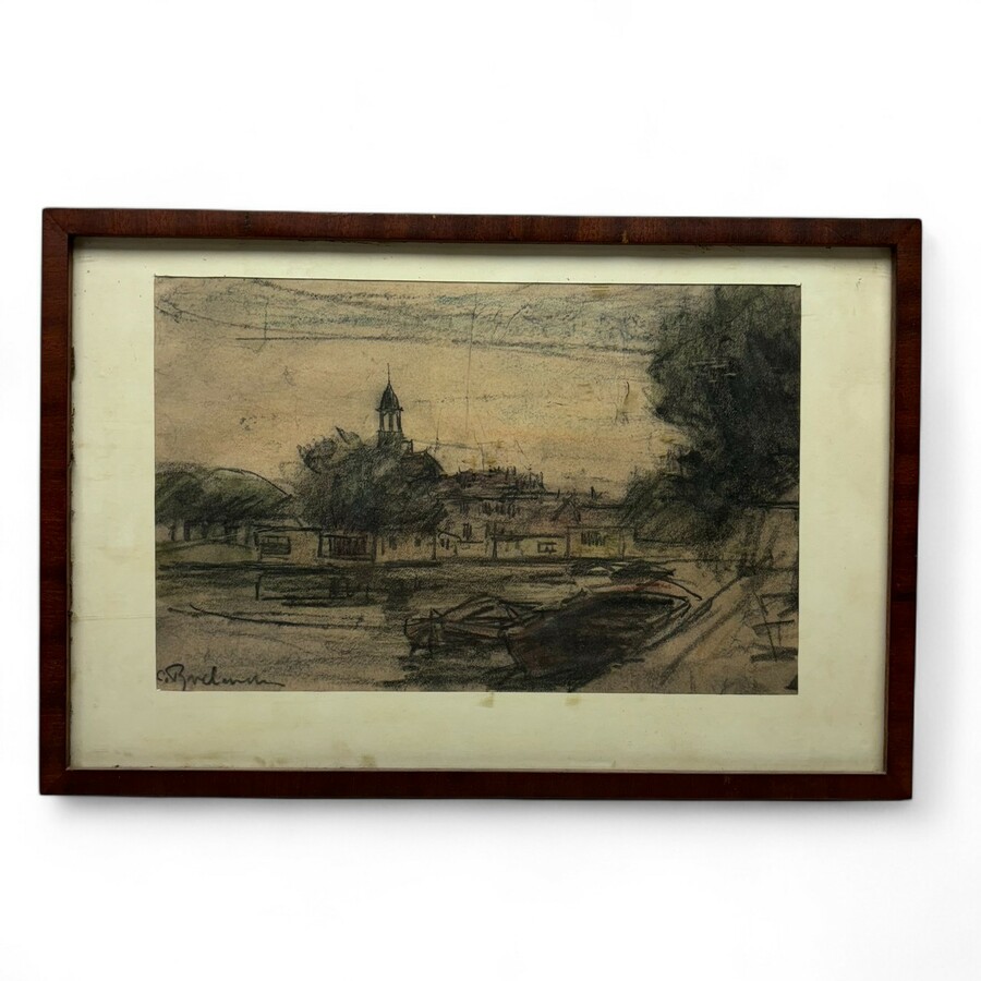 Krijttekening op papier, stal met schapen en kerk op de achtergrond. Rechtsonder gesigneerd Willem van der Nat (Leiden 1864 - 1929).