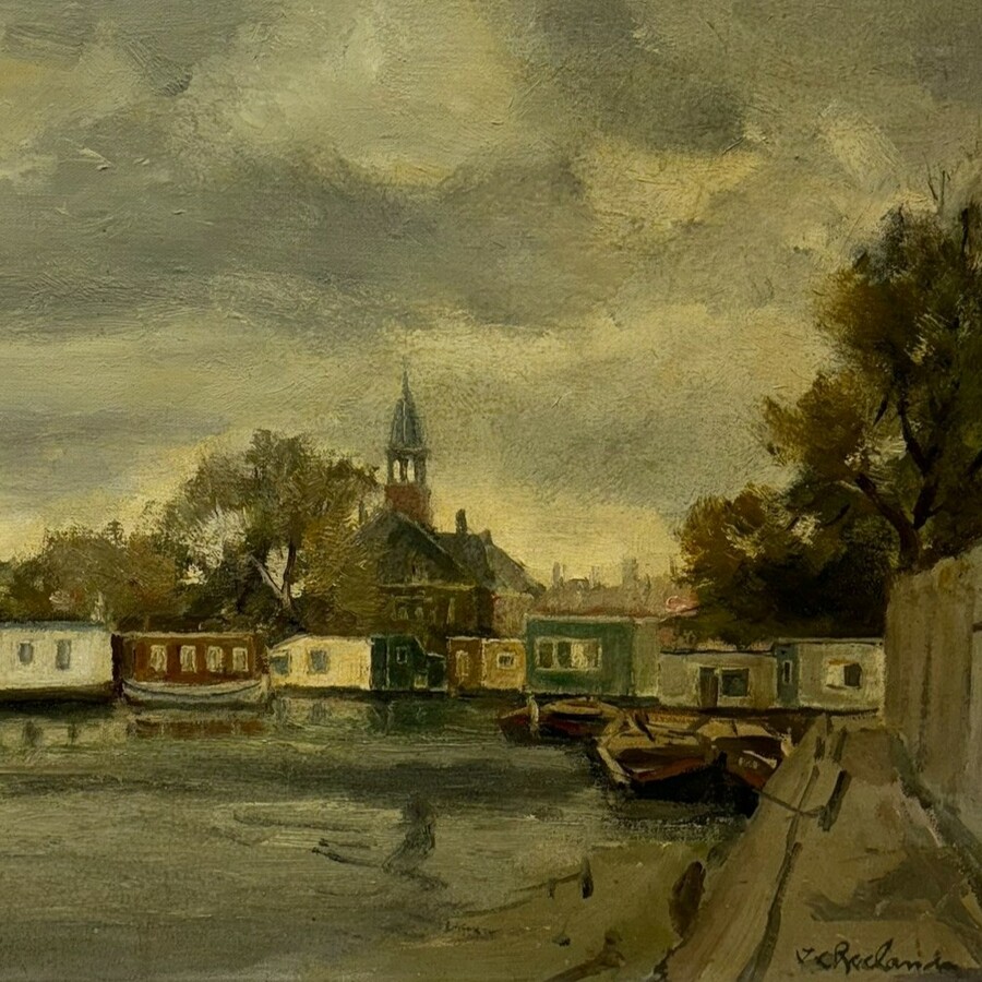 Schilderij, olieverf op doek. Stadsgezicht met woonboten, mogelijk Leiden. Rechtsonder gesigneerd J.C. Roelandse (Leiden 1888 - Leiderdorp 1978).