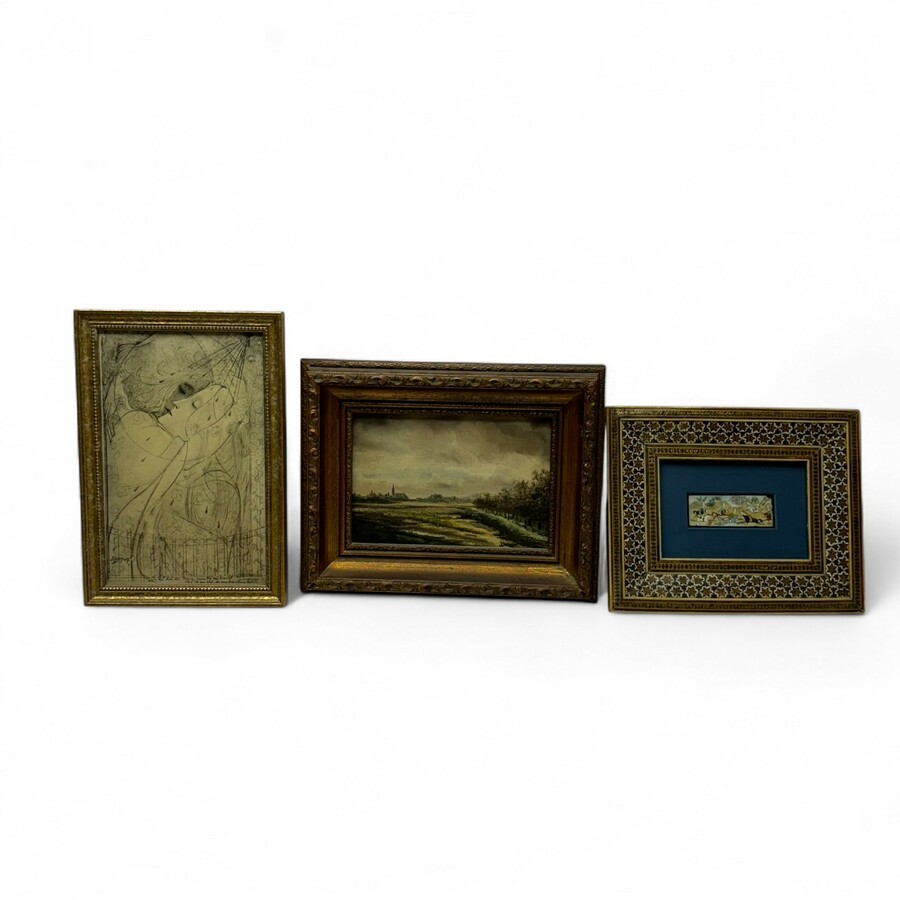 Lot diverse kunstwerken, o.a. prentje Toorop, Perzische beschildering op been, schilderij, gezicht op Diever door J.J. Ouboter, 19e eeuwse gravure Chamonix, en 18e eeuwse kopergravure 'In Den IJ...