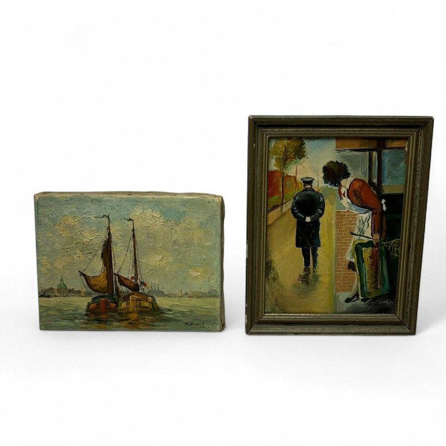 Lot diverse kunstwerken, o.a. gravure Harteveld, ets Grote Markt Haarlem door A. van Hemert, schilderij ploegende boer, schilderij twee schepen bij Amsterdam door W. Busch en een schilderij, win...