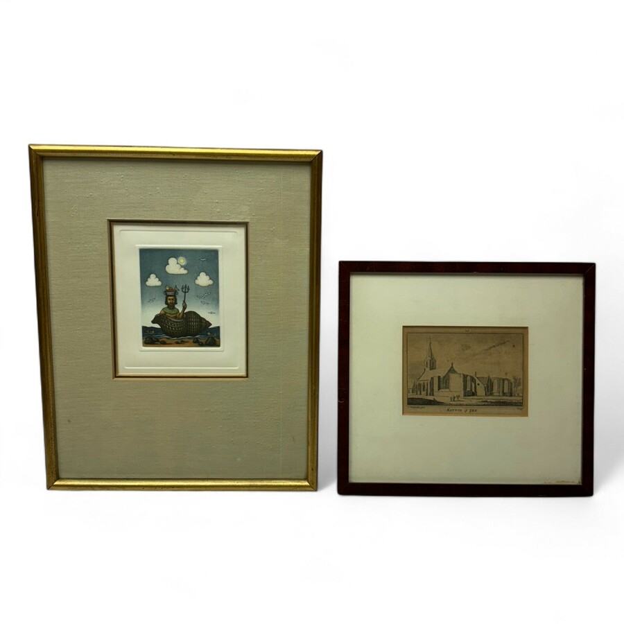 Lot diverse kunstwerken, o.a. 17e/18e eeuwse gravure Katwyk op Zee, antieke gravure 'De Burgt te Leiden en twee schilderijen