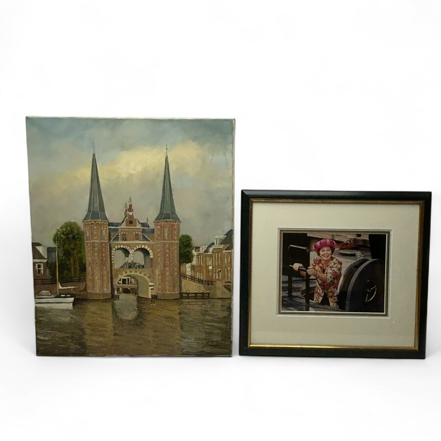 Lot diverse kunstwerken, o.a. twee 18e eeuwse gravures van Leiden, een aquarel met signatuur'Mauve' en een schilderij van de Waterpoort door Boersma