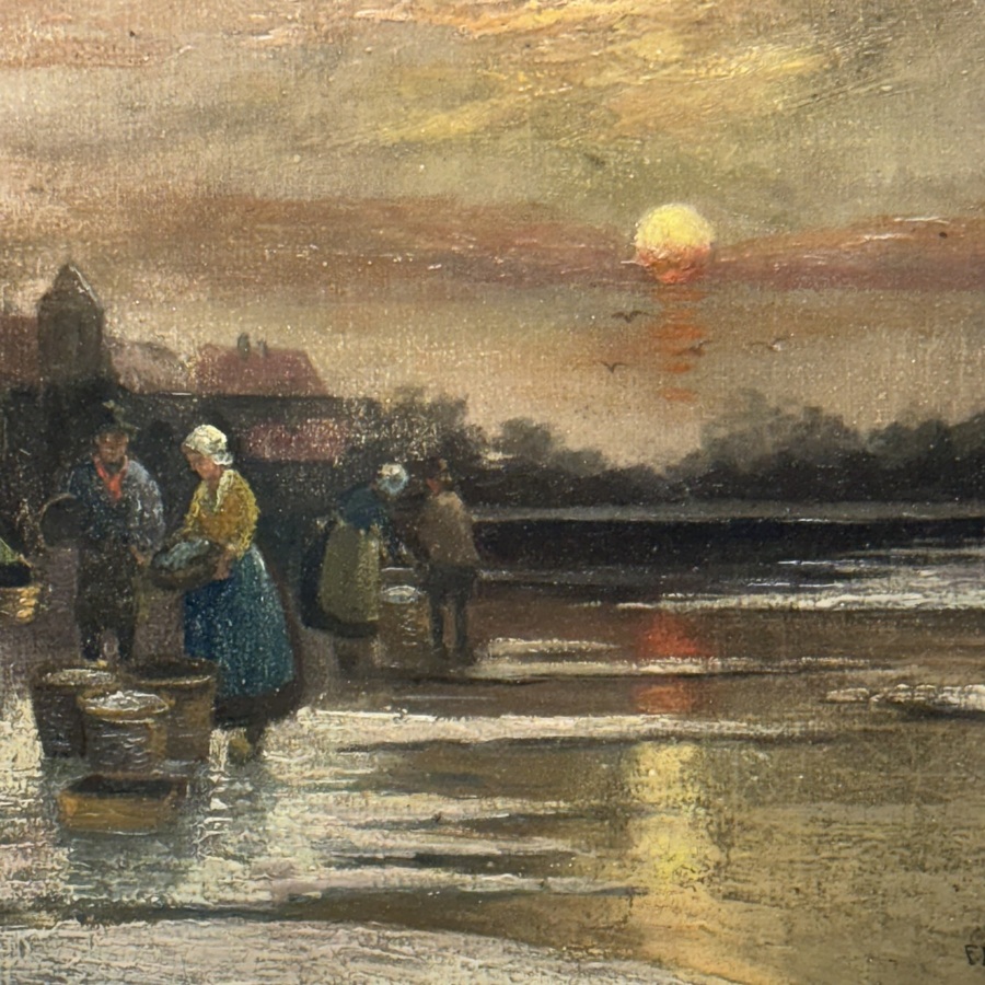 Schilderij, olieverf op doek. Figuren aan het mosselen rapen bij zonsondergang. Rechtsonder gesigneerd F. Munsterveld. Mogelijk Duitsland, laat 19e eeuws.