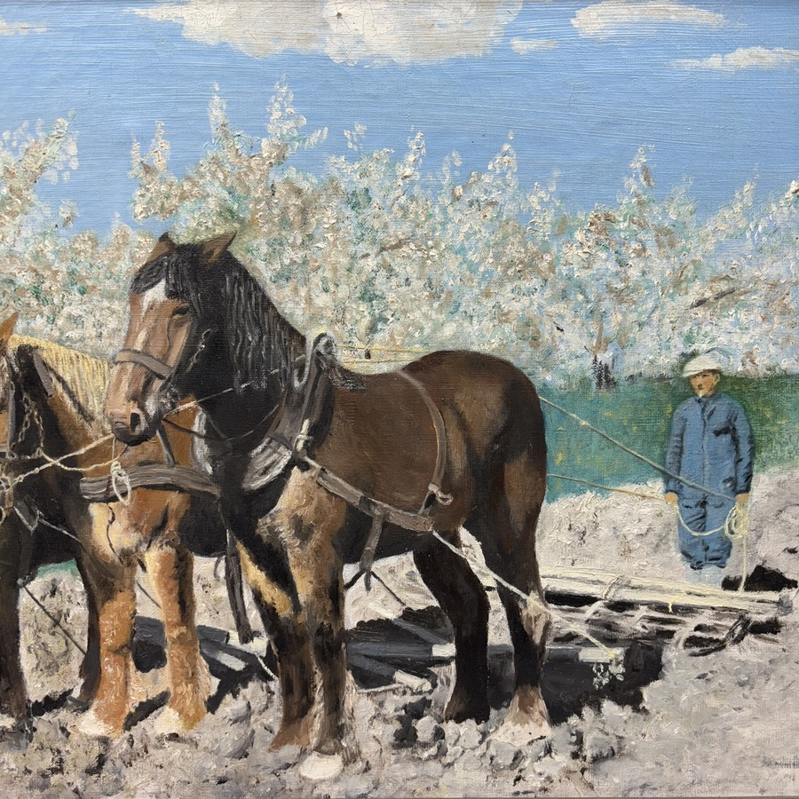 Schilderij, olieverf op doek. Ploegende boer met drie paarden. Ongesigneerd, Hollandse School 20e eeuw.