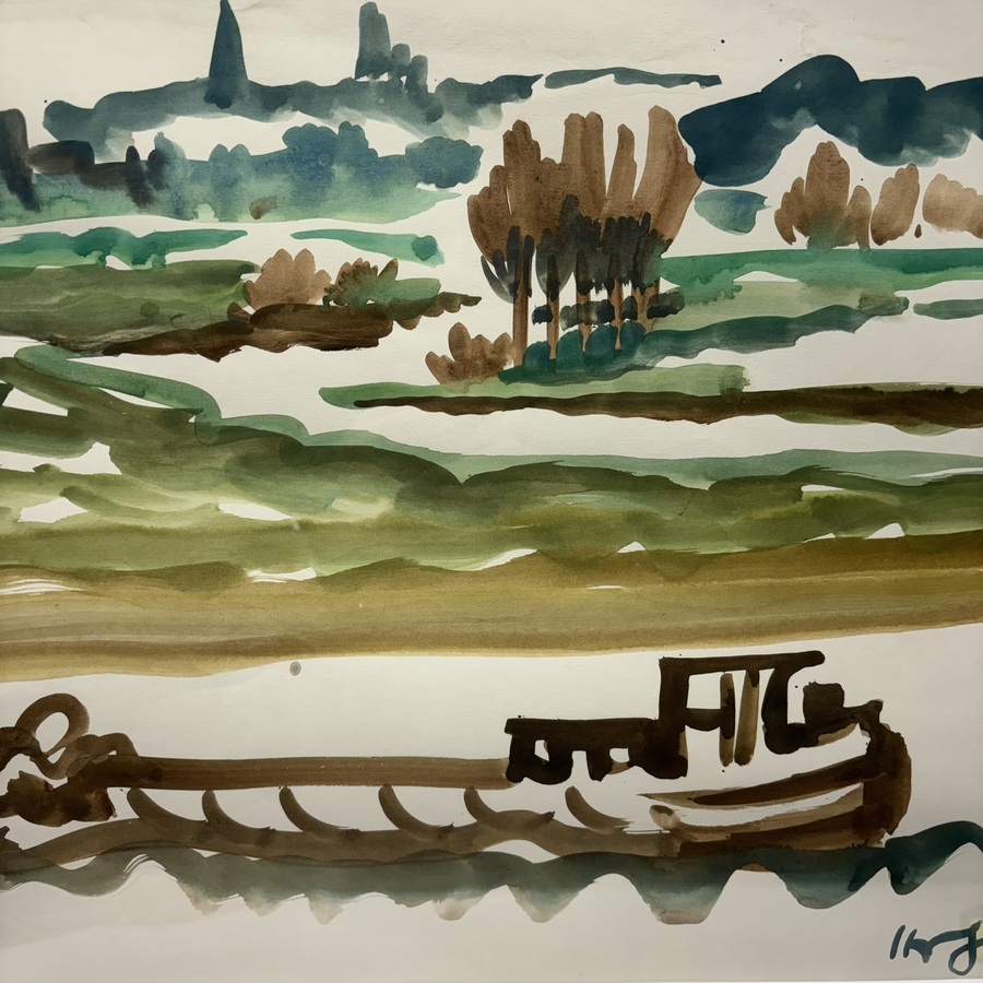 Aquarel op papier, binnenvaartschip in landschap. Rechtsonder onduidelijk gesigneerd