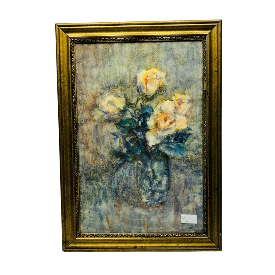 Aquarel op papier, voorstelling van rozen in een vaas. Rechtsonder onduidelijk gesigneerd. Europese School, eerste helft 20e eeuw