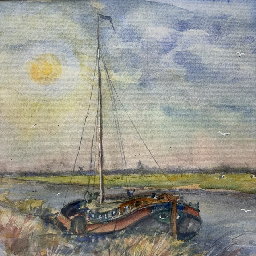 Aquarel op papier, voorstelling van een zeilschip in een vaart. Rechtsonder gesigneerd Abramine Willy Schreuder (Groningen 1922-2012).