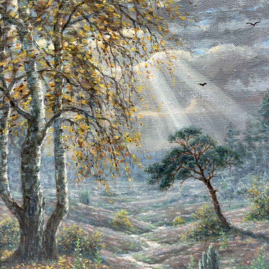 Schilderij, olieverf op doek. Heidegezicht met bomen en vogels. Rechtsonder gesigneerd Dianisius Bernardus Sluiter (Arnhem 1913 - Ede 1990).
