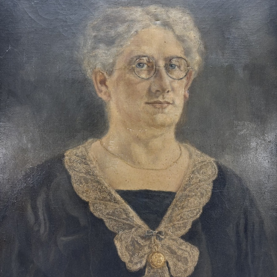 Schilderij, olieverf op doek. Portet van een dame met bril. Rechts gesigneerd Hein Kray (Assen 1901-1995), gedateerd 1931.