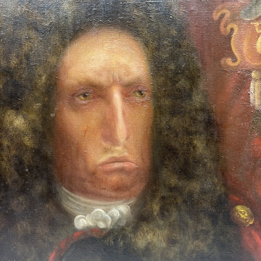 Schilderij, olieverf op doek. Portret van een man in harnas in 17e eeuwse stijl, met rechts een familiewapen. Ongesigneerd, Europese School 19e eeuw.