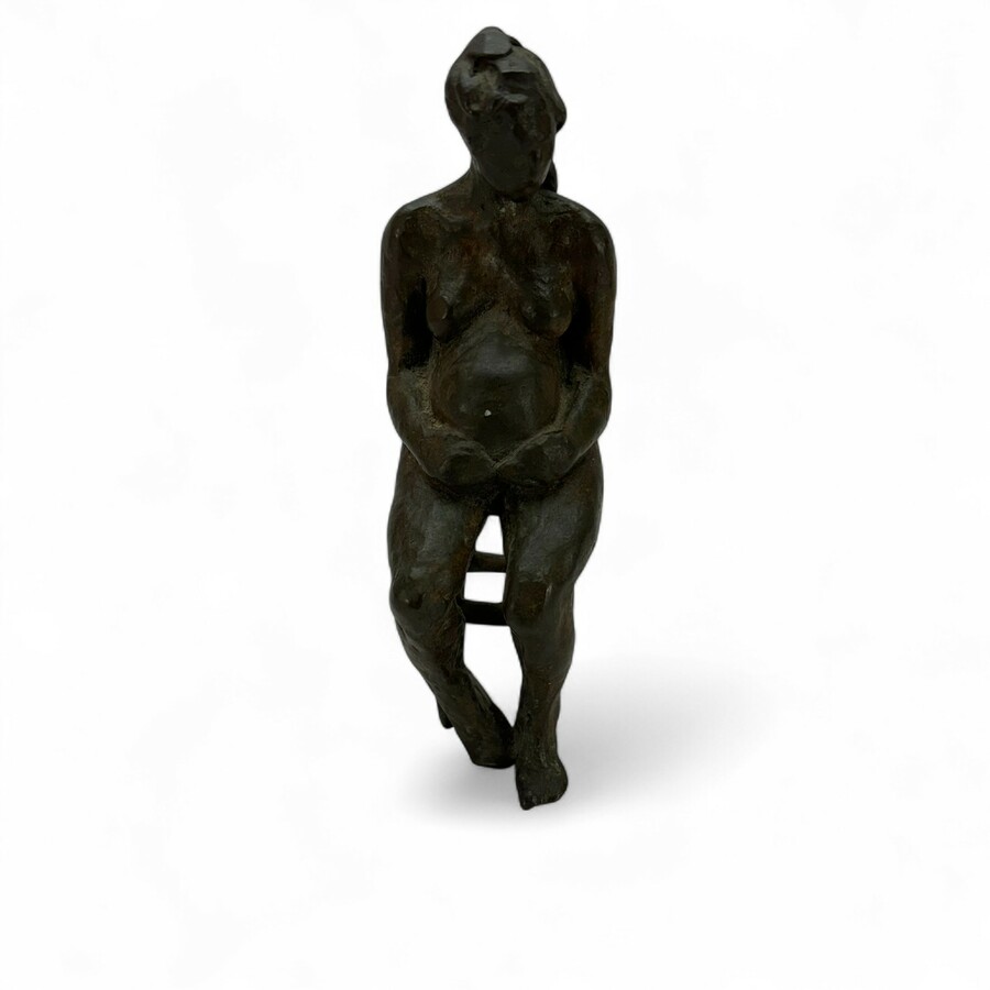 Een 20e eeuws bronzen sculptuur, zwangere vrouw zittend op stoel. Ongesigneerd.