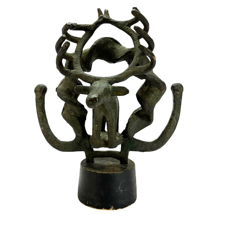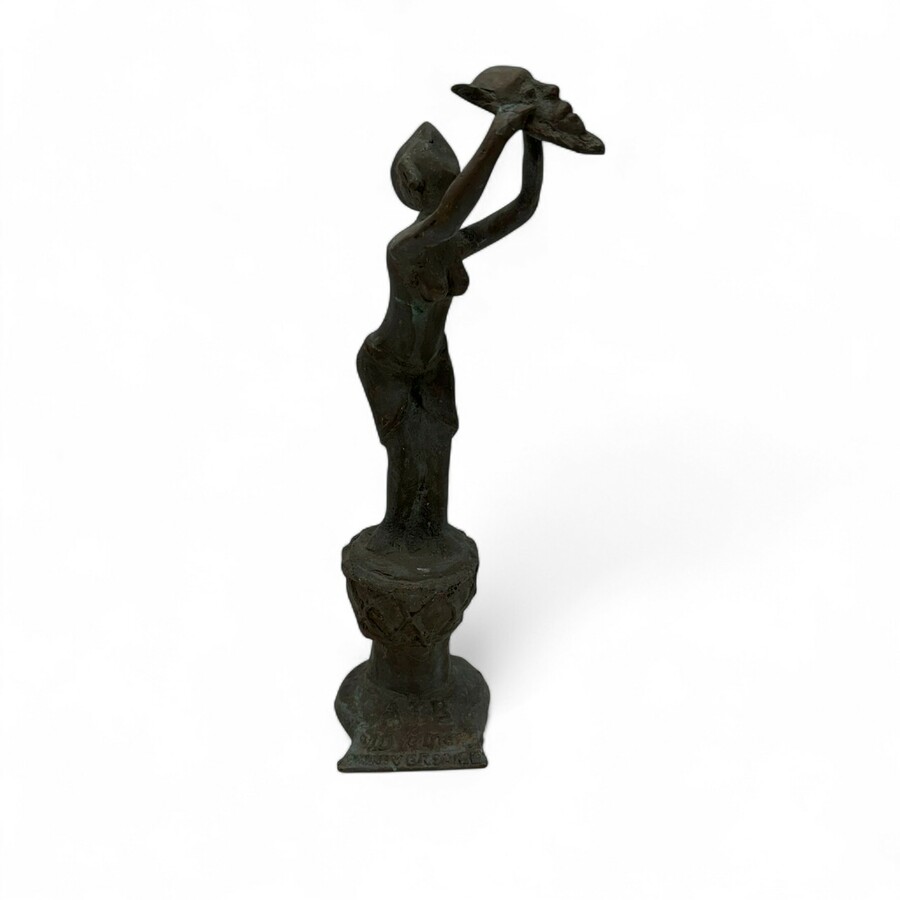 Een 20e eeuws bronzen beeld, vrouw staande op trommel met masker in haar hand. Met tekst op sokkel 'ATB 10 éme anniversaire'