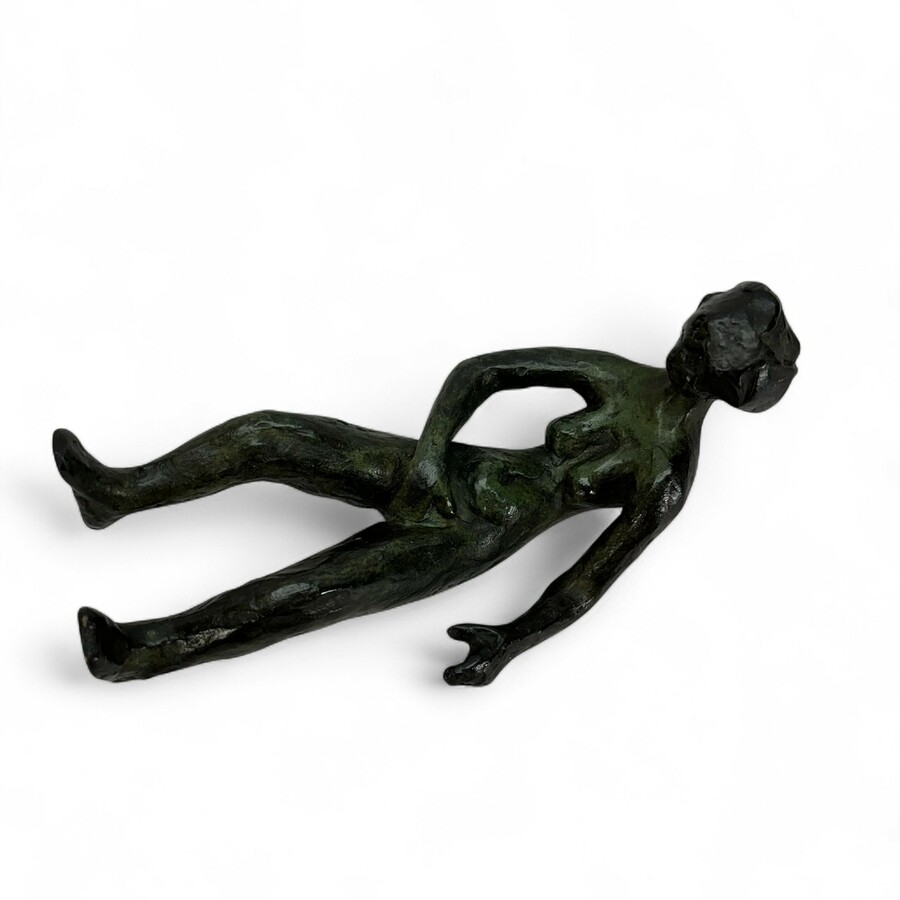 Een 20e eeuws groen gepatineerd bronzen sculptuur, liggende vrouw. Volgens overlevering door Ko de Ree (Nice 1934 - Eindhoven 2010)