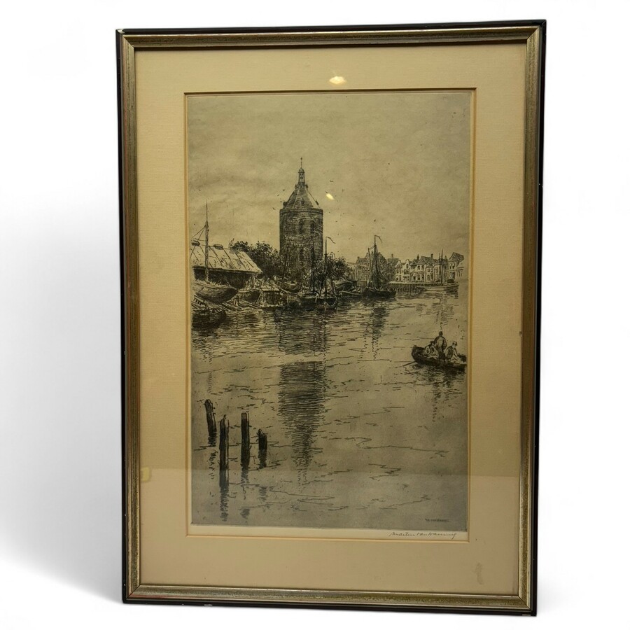 Ets op papier, de haven van Enkhuizen met de Drommedaris op de achtergrond. Rechtsonder gesigneerd Martin van Waning (Den Haag 1889 – Dokkum 1972).