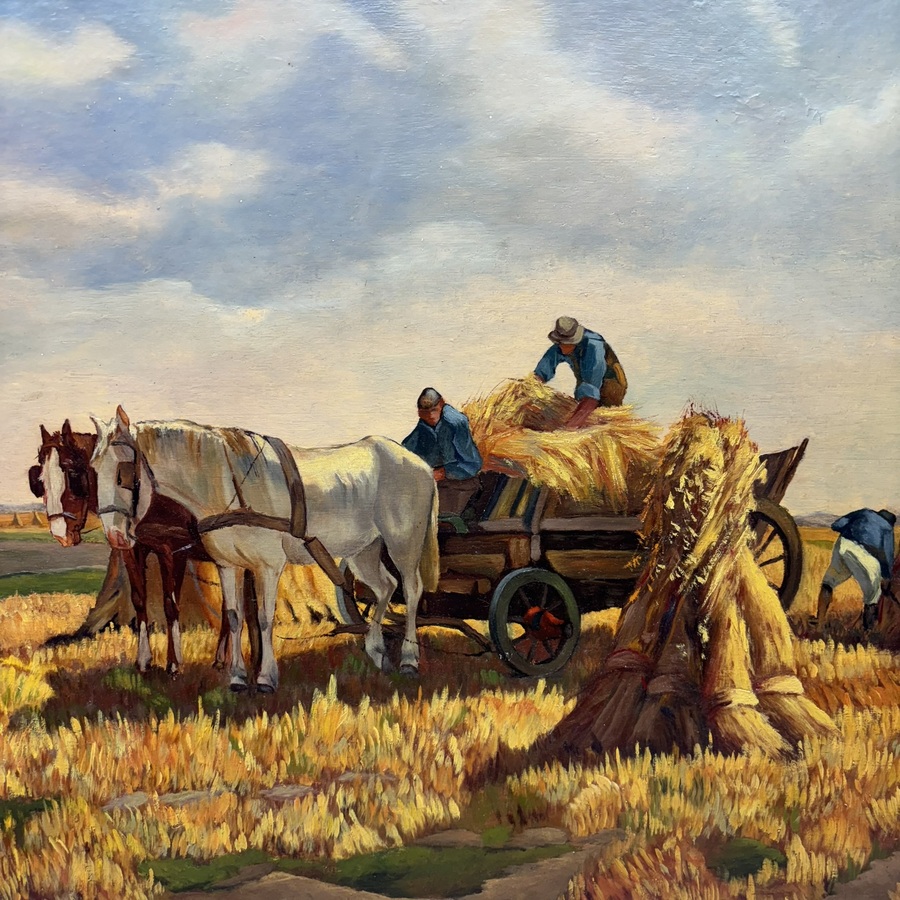 Schilderij, olieverf op paneel. Voorstelling van een boerenwagen in het veld met drie boeren. Rechtsonder gesigneerd Jan. G. Altena