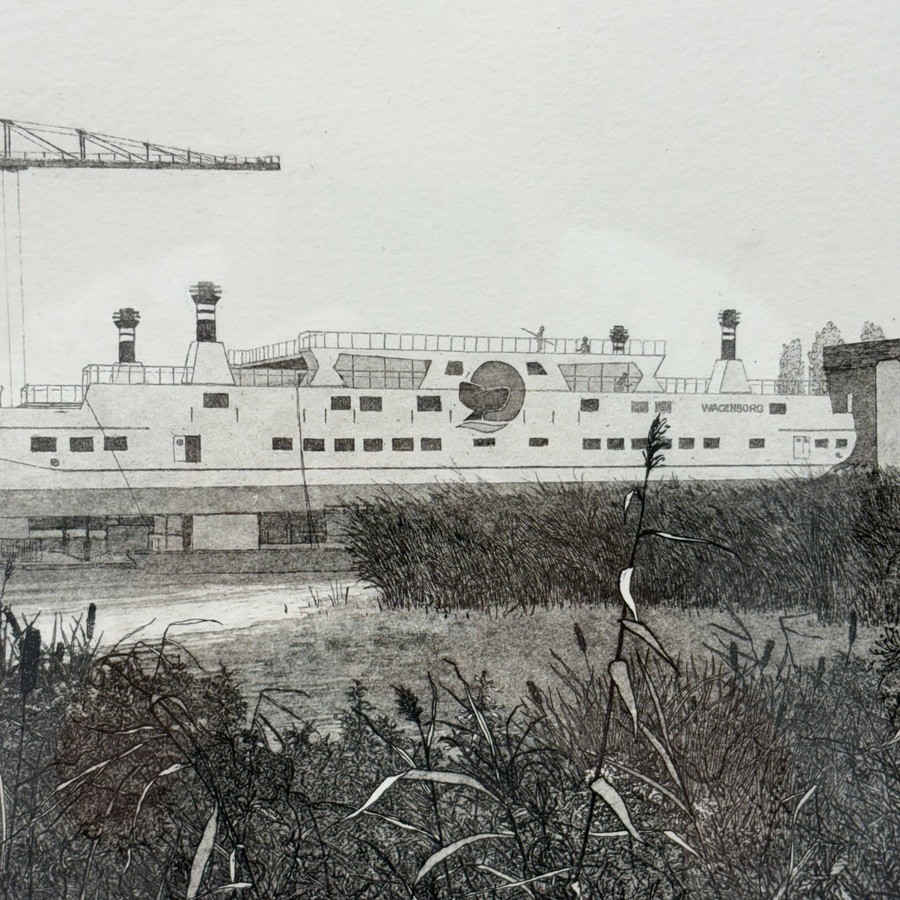 Ets op papier, ‘scheepswerf Bijlsma in Wartena’, met schip van Wagenborg. Linksonder gesigneerd Reinder Homan (Smilde, 1950), gedateerd 1994. Oplage 2/25