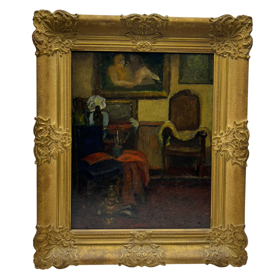 Schilderij, olieverf op paneel. Interieur met meubilair, doofpot en schilderijen op de achtergrond. Rechtsonder gesigneerd G. Sijthoff. In vergulde ornamentenlijst.