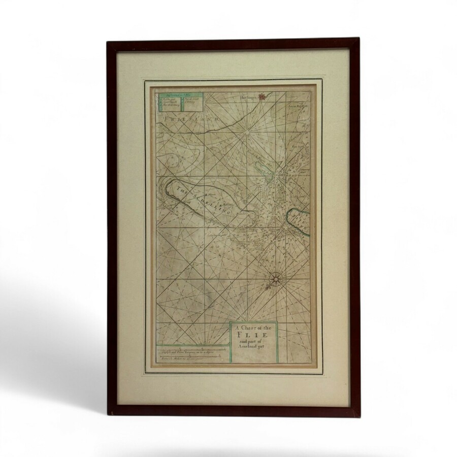 Een antieke 18e eeuwse zeekaart, "a chart of the Flie and part of Ameland gat”, met afbeelding van Terschelling