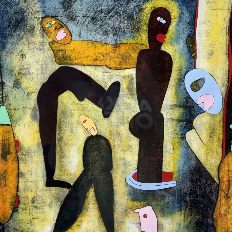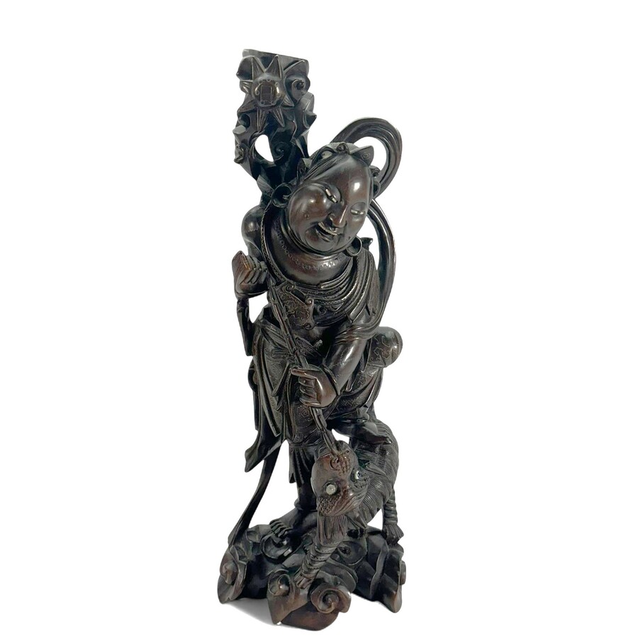 Een 19e of 20e eeuws houten beeld,figuur met dier, ingelegd met zilverdraad.