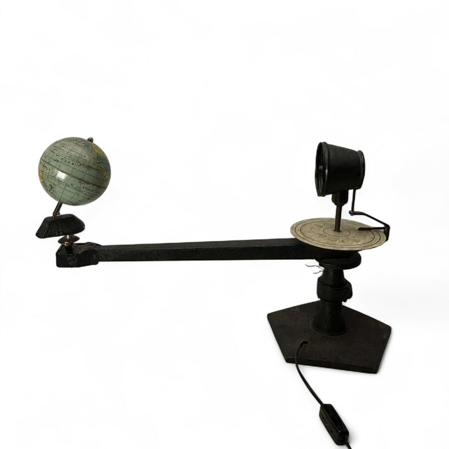 Een 20e eeuws demonstratieinstrument. zgn. tellurium. Draaibaar, met blikken wereldbol en cerlichting. Vermoedelijk Duits, Mauthe, ca. 1950