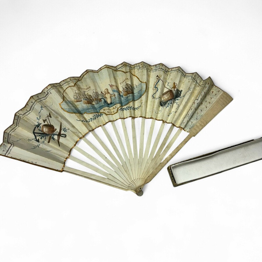Een antieke 18e eeuwse waaier, met voorstelling van diverse schepen en zeemonster in medaillon, met links 'Zoutman', rechts 'Parker' en daaronder 'Doggersbank'. Betreft slag bij de Doggersbank, ...