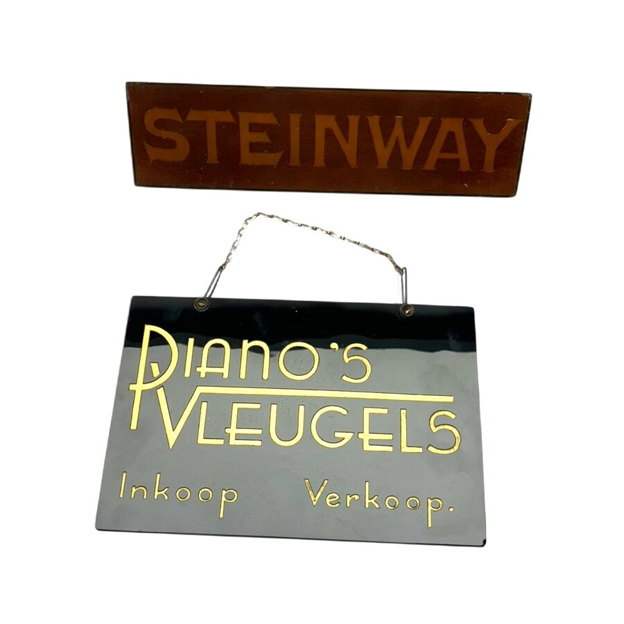 Lot: een geëtst glazen plaatje met opschrift ‘Piano’s Vleugels Inkoop Verkoop’. Met daarbij een vroeg 20e eeuws ingelegd houten reclamebordje voor Steinway.