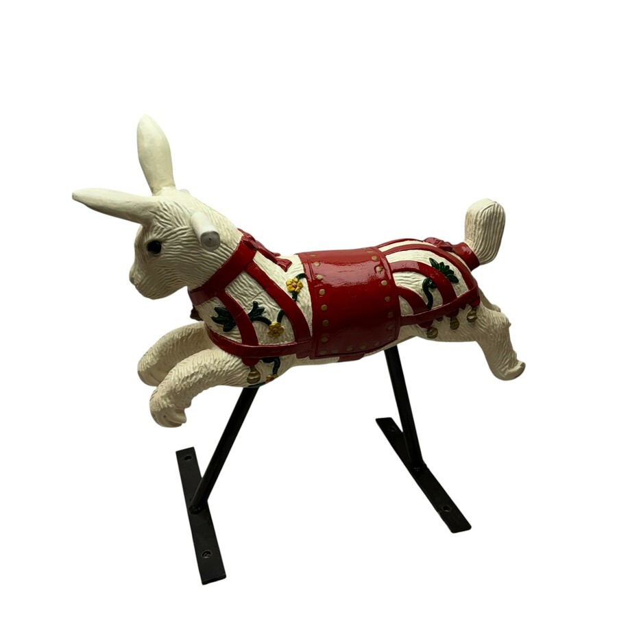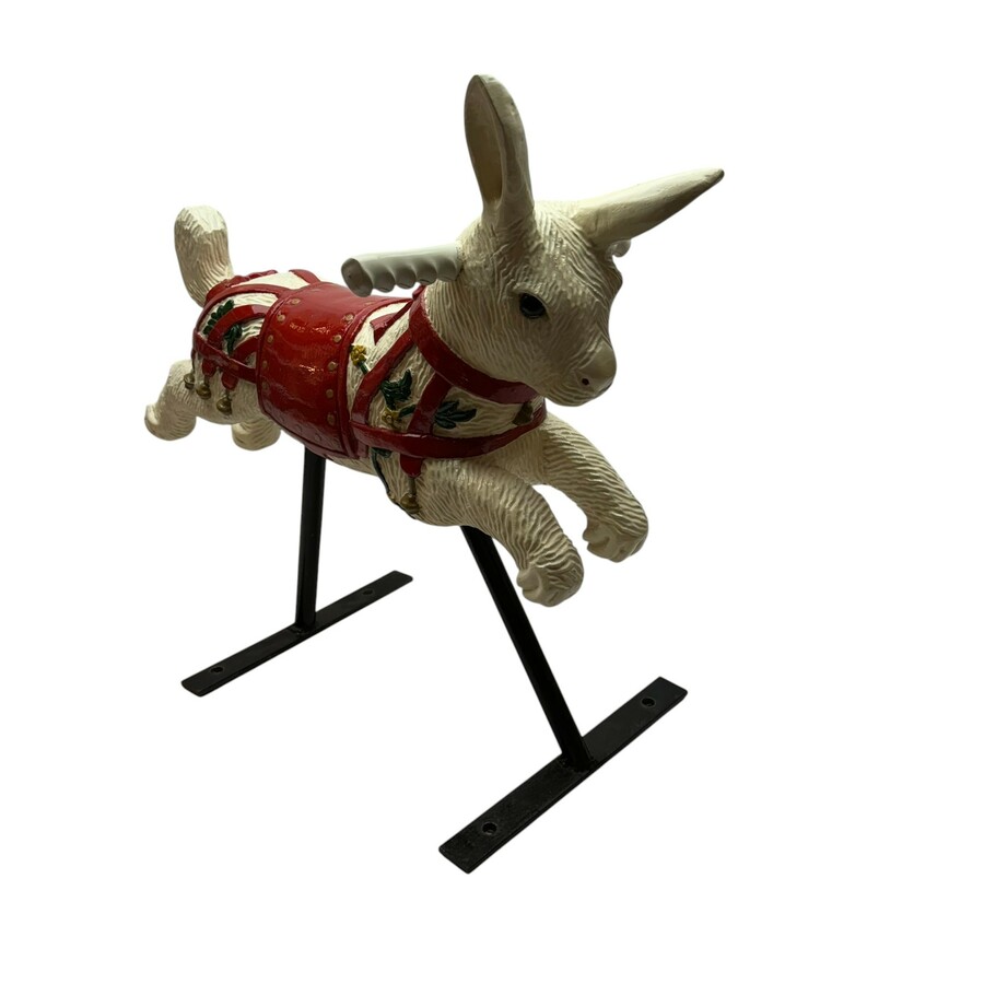 Een 20e eeuws houten beschilderd draaimolen dier, lammetje. Op zwart metalen onderstel.