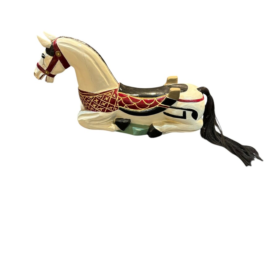 Een 20e eeuws gepolychromeerd houten kermispaard, liggend, met zwarte staart.
