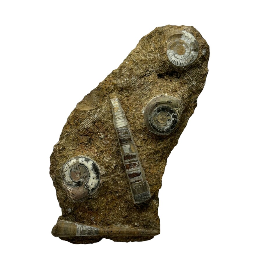 Grote brok gesteente met fossielen, waaronder drie gefossiliseerde ammonieten