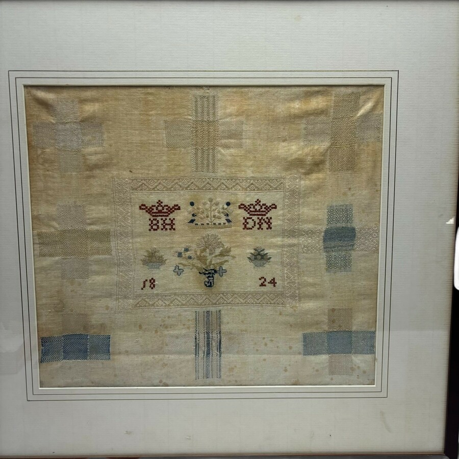 Een vroeg 19e eeuwse proeflap, . Met decor van kronen, monogrammen, fruitmanden en bloemen. Gedateerd 1824