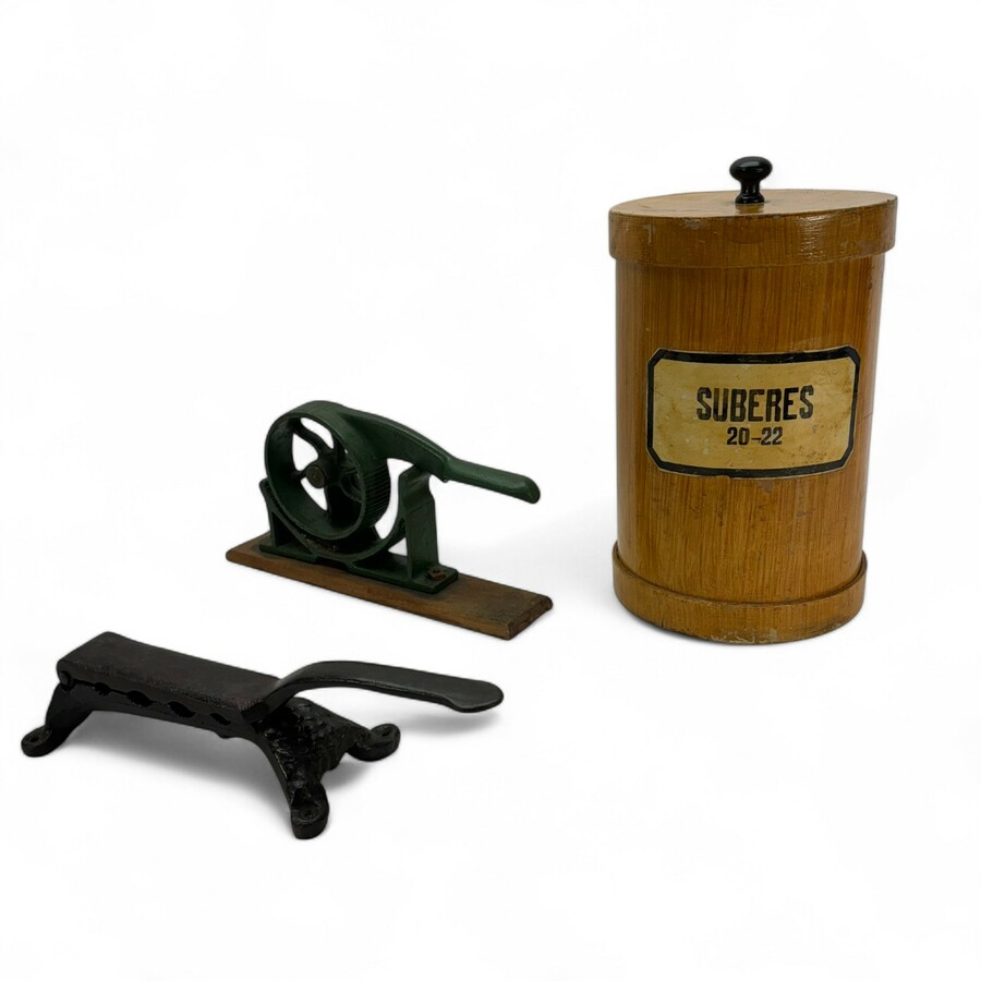 Lot vroeg 20e eeuwse apothekersartikelen: een grote houten trommel vol kurken en twee gietijzeren instrumenten, voor het persen van kurken