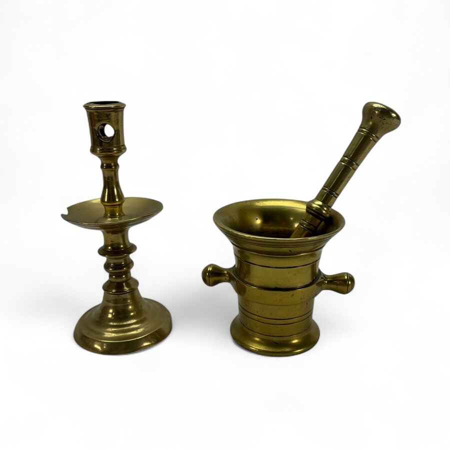 Een 19e eeuwse bronzen vijzel met stamper, met daarbij een bronzen schijfkandelaar, Hollands, vroeg 18e eeuws. Conditie: schijfkandelaar met beschadiging aan de schijf.