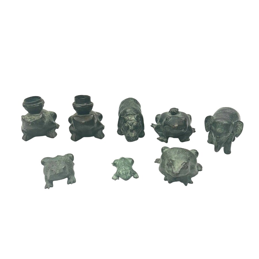 Een lot van acht gepatineerde bronzen sculpturen van dieren. Waarvan zes kikkers of padden, een nijlpaard en een olifant. 20e eeuws.