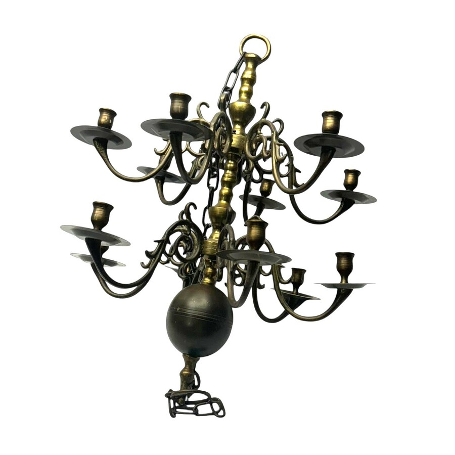 Een antieke messing twaalf lichts kaarsen bolkroon. Aan een messing gesmeed ketting.