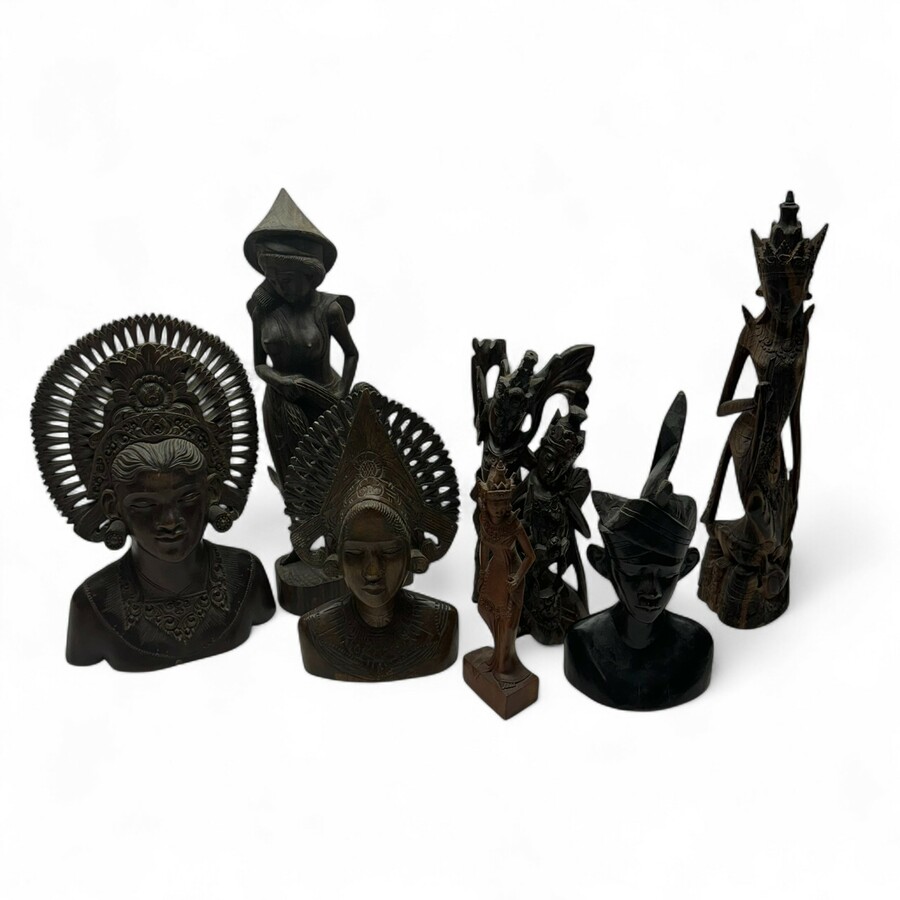 Zeven Indonesische gestoken houten beelden, waaronder bustes en danseressen, alle 20e eeuw
