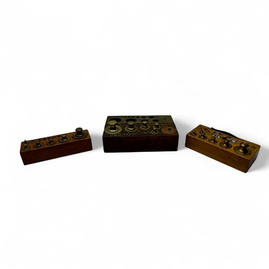Drie sets met koperen knopgewichten, waarvan twee laboratoriumsets met zeer kleine eenheden: één in originele kist, jaren '40 -pincet ontbreekt-, en set in originele houten blok, inclusief pince...