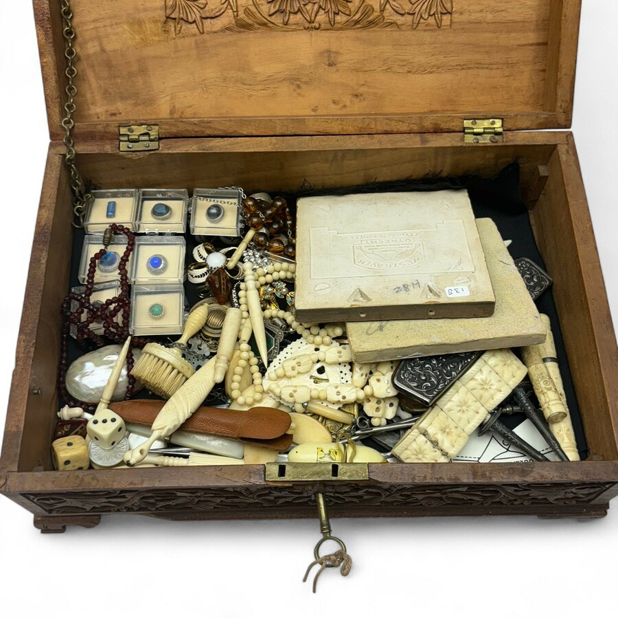 Lot divers kleingoed, waaronder: benen en parelmoeren naaigerei en accessoires, sieraden, twee kammetjes in verzilverd foedraal, twee aardewerk tegels, etc., alles verzameld in een gestoken hout...