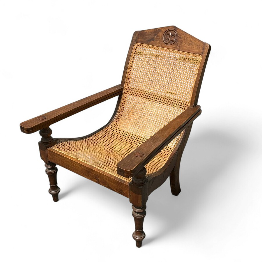 20e eeuwse koloniale teakhouten plantagestoel met rieten zitting en uitklapbare armleuningen
