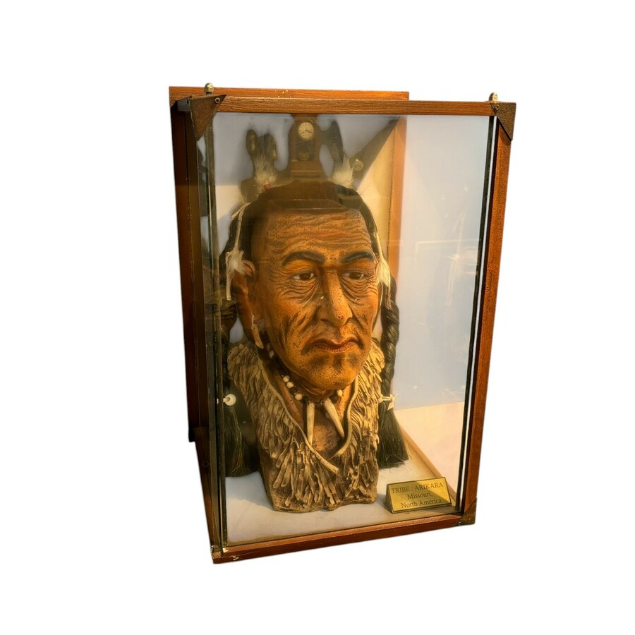 Een 20e eeuwse buste, indiaan, met tekst 'Tribe: Arikara Missouri North America'. In vitrinekastje.