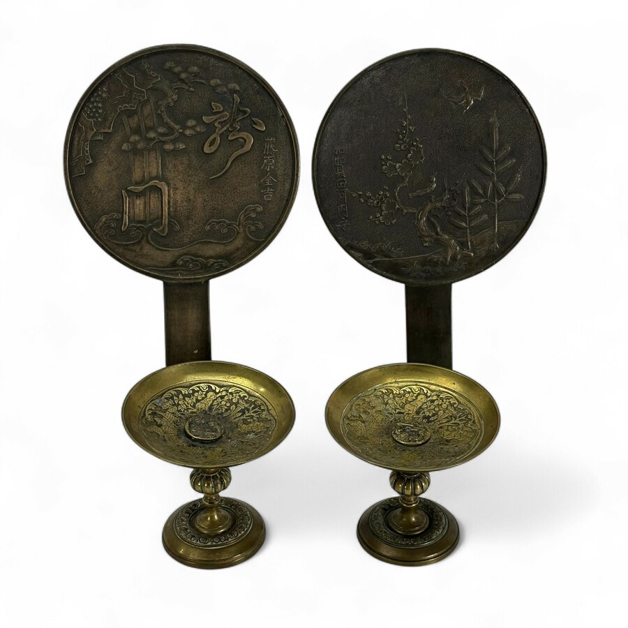Twee bronzen Japanse spiegels, en twee tazza's met voorstelling van van de vier jaargetijden