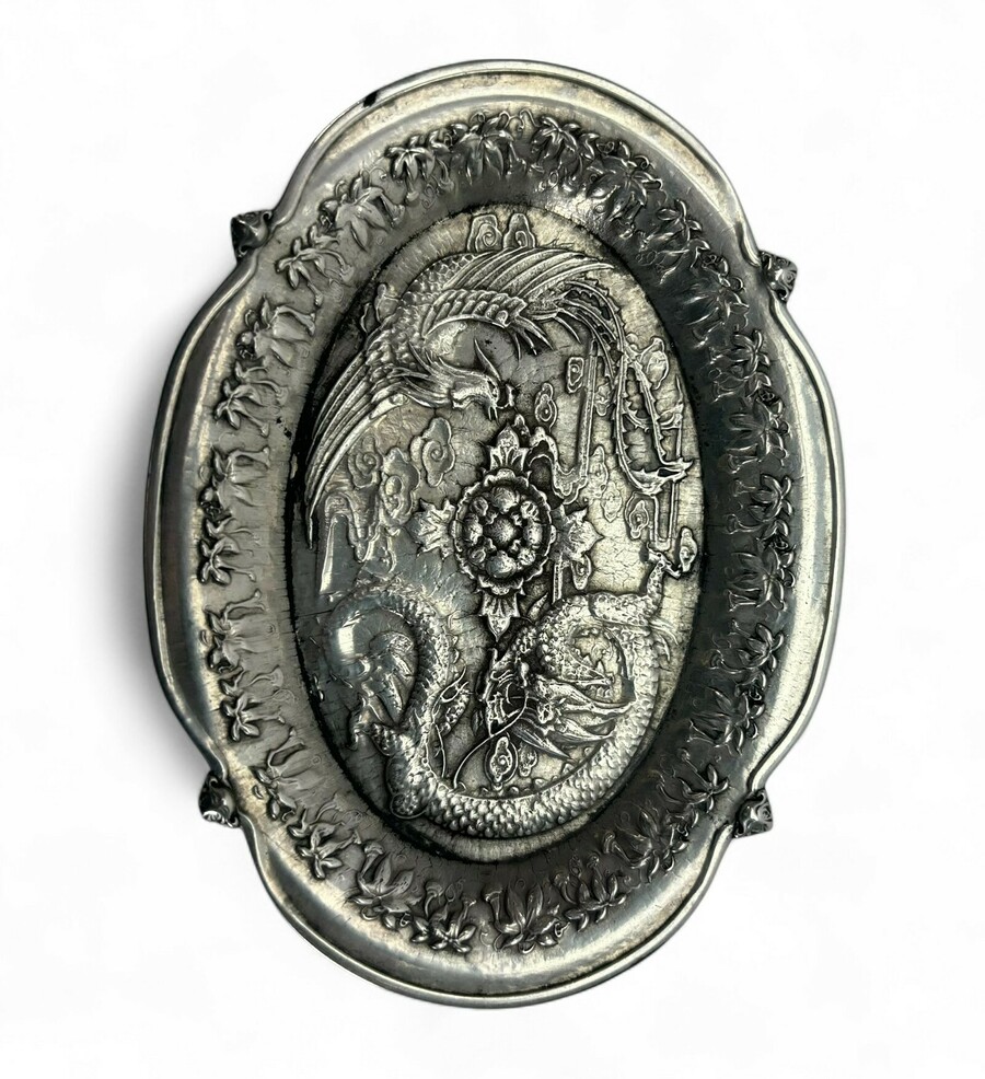 Een 20e eeuws Chinees metalen schaaltje met voorstelling van vuurvogel.