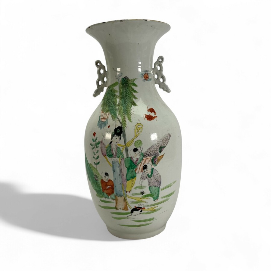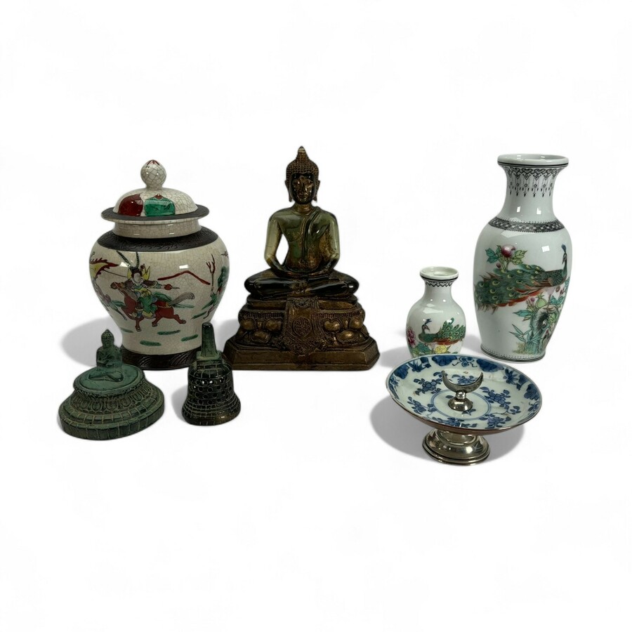 Lot divers aziatica, waaronder een 20e eeuwse kunststof Boeddha, twee 20e eeuwse Chinese vaasjes, PROC periode, een Nanking dekselvaas en een 18e eeuws blauw-wit en capucijner schoteltje, verbou...