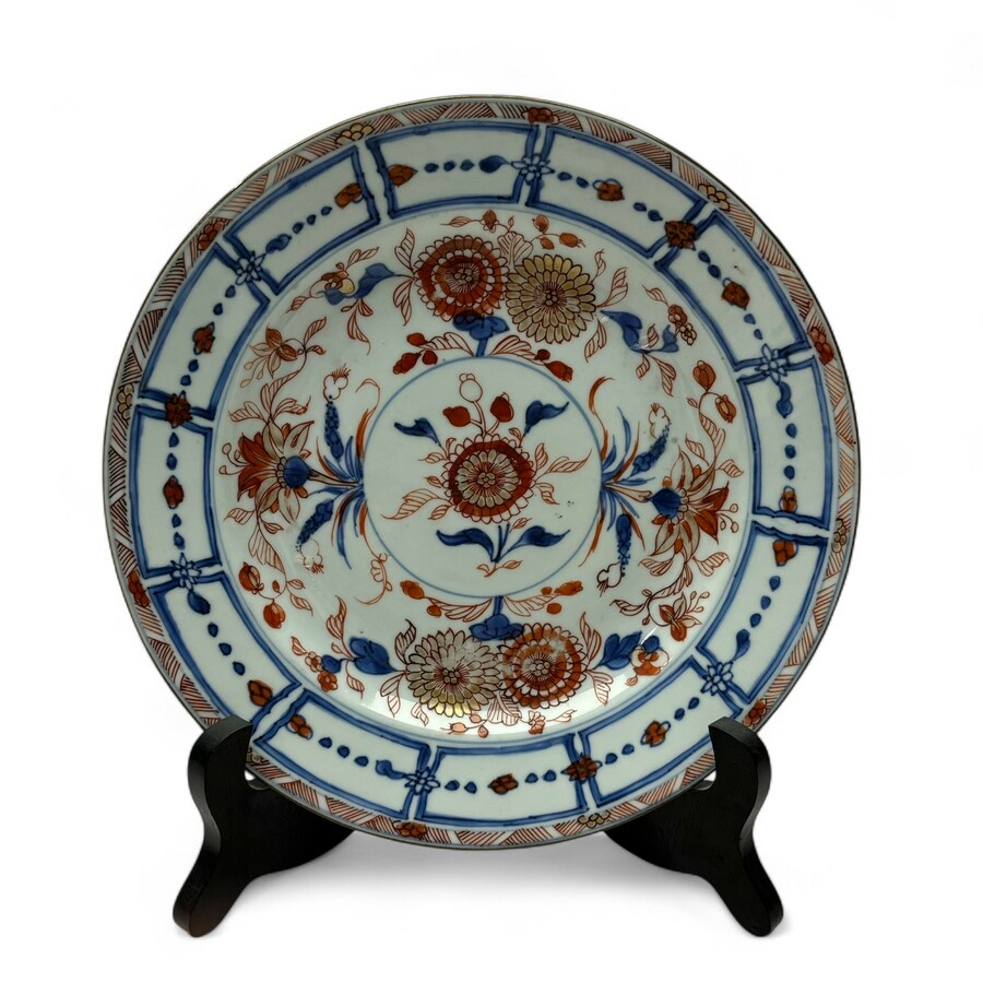 Een antiek 18e eeuws Chinees porseleinen bord, Kangxi periode (1661-1722), met onderglazuur blauw en bovenglazuur rood-goud decor van bloemen.