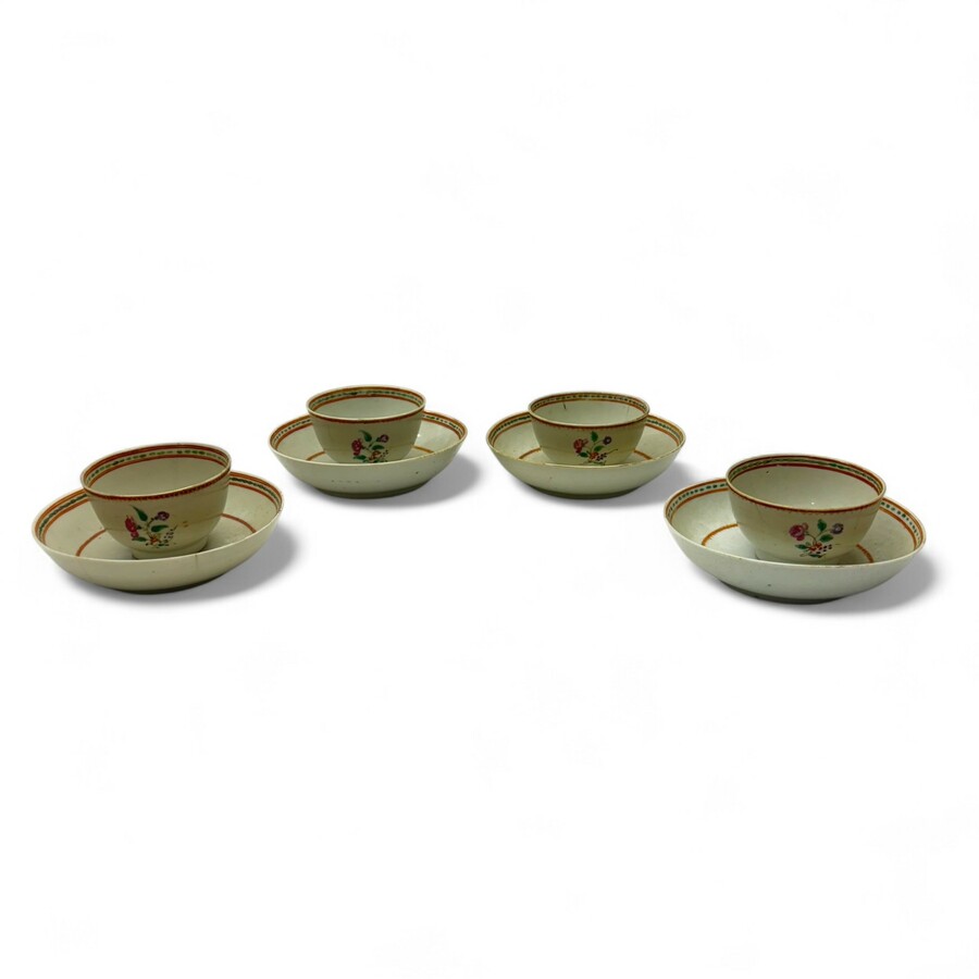 Lot van vier antieke 18e eeuwse Chinees porseleinen kop en schotels, Famille Rose met floraal decor, Qianlong periode (1735-1796).