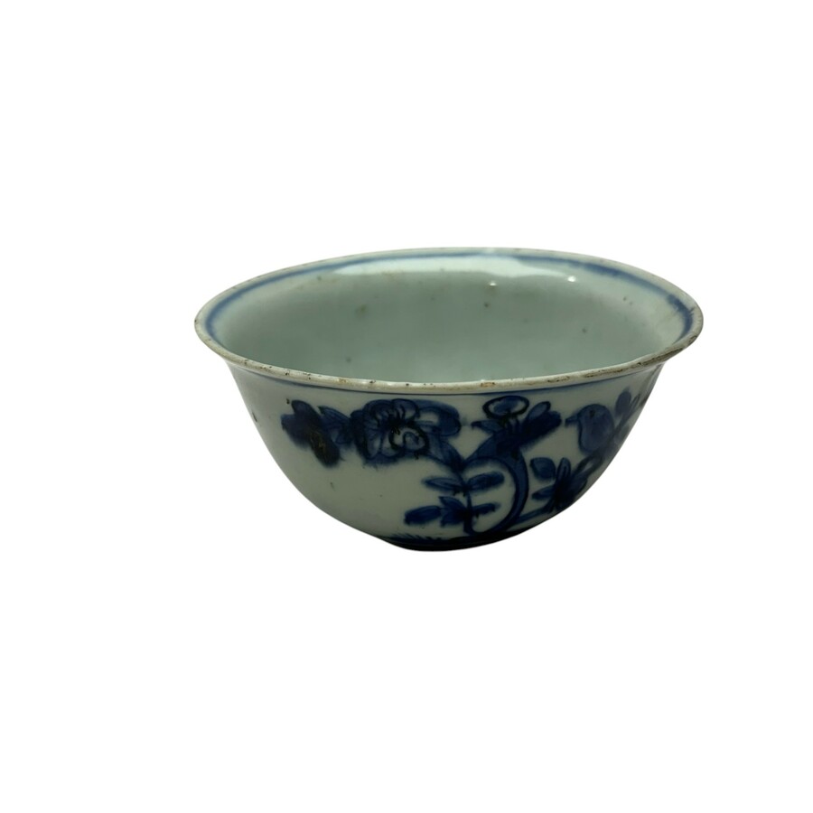 Een antieke vroeg 17e eeuwse Chinees porseleinen kom, met onderglazuur blauw-wit decor van vogel op een tak. Aan de onderzijde gemerkt. Wanli periode (1572-1620).