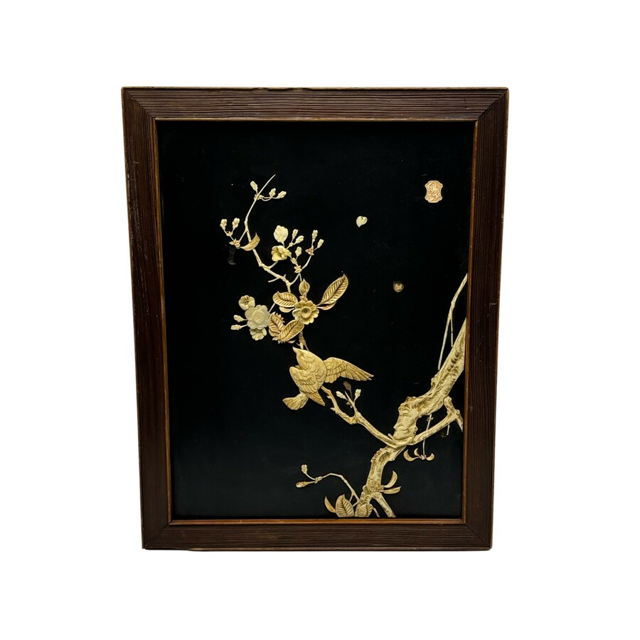 Een antiek laat 19e eeuws Japans lakwerken paneeltje, ingelegd met parelmoer en been. Voorstelling van een vogel op een tak. Linksonder gesigneerd.